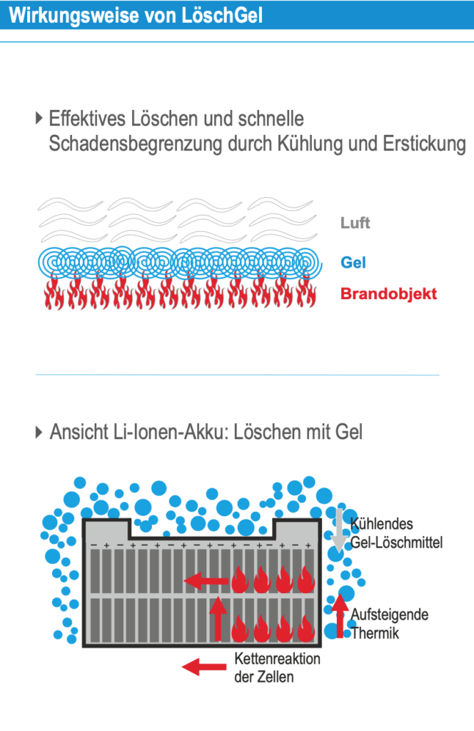 Löschen mit Gel ist vor allem die Lösung bei Problembränden wie z.B. in der kunststoffverarbeitenden Industrie, in Recyclingbetrieben, auf Deponien oder auch insbesondere für die Lagerhaltung von Lithium-Ionen-Akkus.